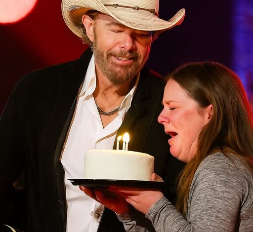 In the front rows, a woman named Sarah held onto a small white box like it was treasure. Inside rested a simple strawberry cheesecake — Toby’s favorite, she’d once read. It wasn’t his birthday, but something about the night whispered this might be the last chance. Her hands trembled, her heart pounding to the rhythm of his song.