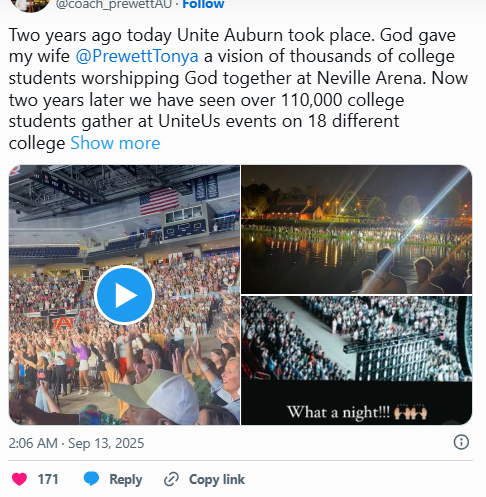 Chad Prewett, a former Auburn University assistant basketball coach and husband of Tonya, recently shared on X that in the last two years, the ministry has reached 110,000 college students gathering on 18 different college campuses.