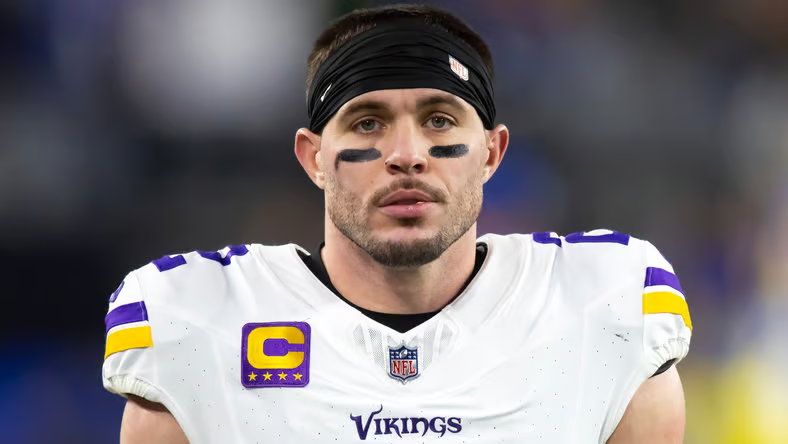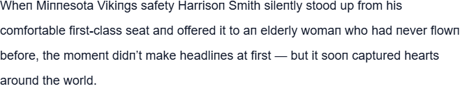 BB.Harrison Smith in Vikings jersey, smiling warmly on an airplane, handing over a boarding pass to an elderly stranger with a first-class seat tag, soft lighting emphasizing compassion, American flag subtle in the background.