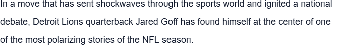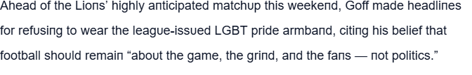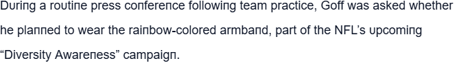 Home/Uncategorized/BB.SHOCKING NFL: Jared Goff REFUSES TO WEAR LGBT ARMBAND – “FOOTBALL IS A GAME, NOT POLITICS!” Uncategorized BB.SHOCKING NFL: Jared Goff REFUSES TO WEAR LGBT ARMBAND – “FOOTBALL IS A GAME, NOT POLITICS!” cutin1231 minute ago0 0 Less than a minute cutin1231 minute ago0 0 Less than a minute Facebook Twitter LinkedIn Tumblr Pinterest Reddit VKontakte Share via Email Print