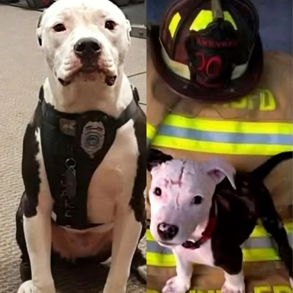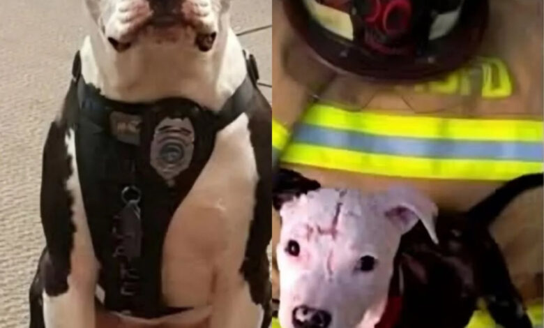 So when the firehouse decided to make it official, no one was surprised. Jake was sworn in as their very first official K9, complete with a badge that gleamed against his collar. At the ceremony, the same men and women who had pulled him from the flames stood beside him, their uniforms crisp, their smiles wide. Jake, once a burned and broken pup, now stood tall among heroes as one of their own.
