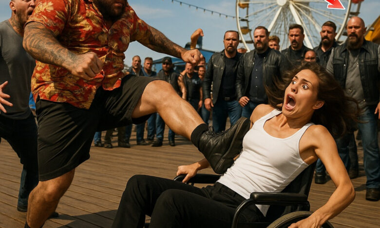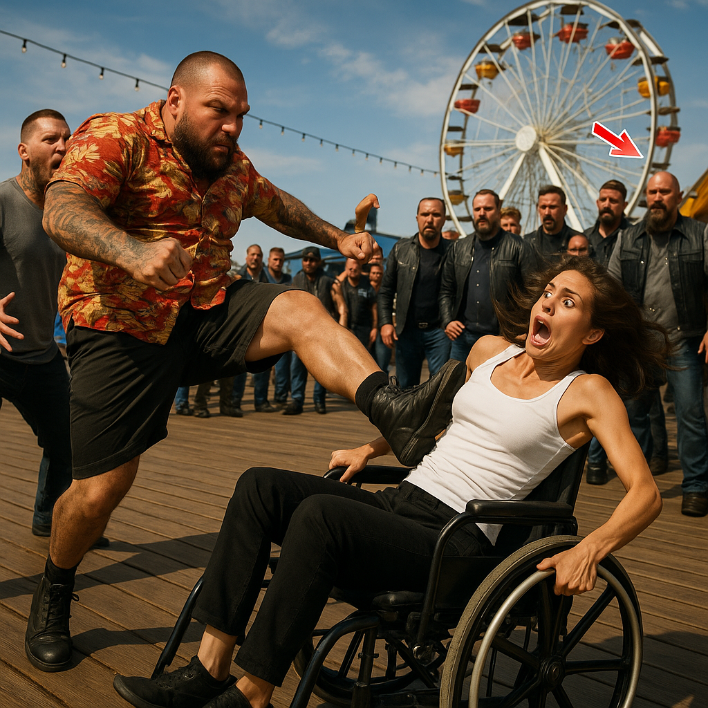 “Move, cripple!” one of the teens shouted, shoving the disabled girl toward the edge of the Santa Monica Pier. Laughter echoed—until the deep rumble of engines cut through the air. Within seconds, a wall of leather-clad bikers surrounded the bullies, their leader stepping forward with a glare that silenced the crowd. What happened next turned a moment of cruelty into one of unforgettable justice and unexpected kindness.