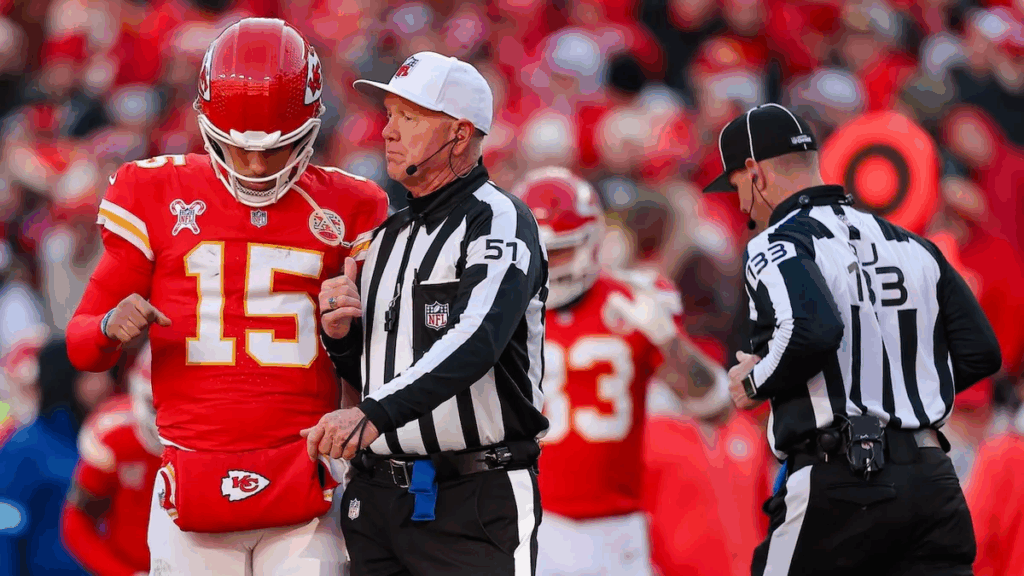 (Suggested Image: A split graphic: One side shows a close-up of Patrick Mahomes looking furious and incredulous; the other side shows a referee throwing a flag with a sinister, exaggerated look, overlaid with the words “RIGGED GAME.”)