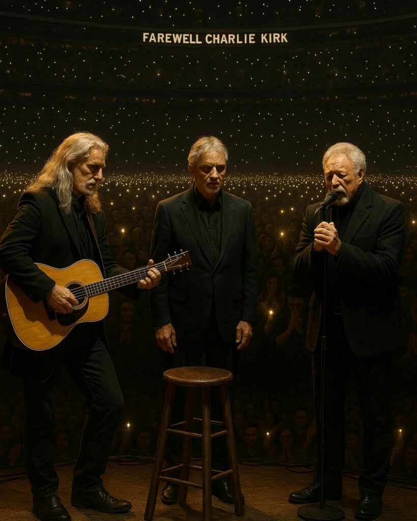 His voice — strong, soulful, and filled with a kind of sacred sorrow — rose into the night. Moments later, Bocelli’s soaring tenor joined in, followed by Jones’s deep, weathered baritone. The sound they created wasn’t for applause. It wasn’t a show. It was a farewell — a prayer set to music, in memory of Charlie Kirk, whose sudden passing at just 31 had stunned and saddened a nation.