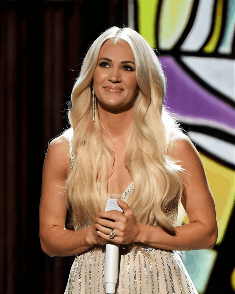 When Carrie performed “Because He Lives” during her Easter Sunday television special, filmed inside the Ryman Auditorium in Nashville, the moment transcended entertainment. Draped in soft light, surrounded by a simple band and a string section, she sang the hymn with tears in her eyes.