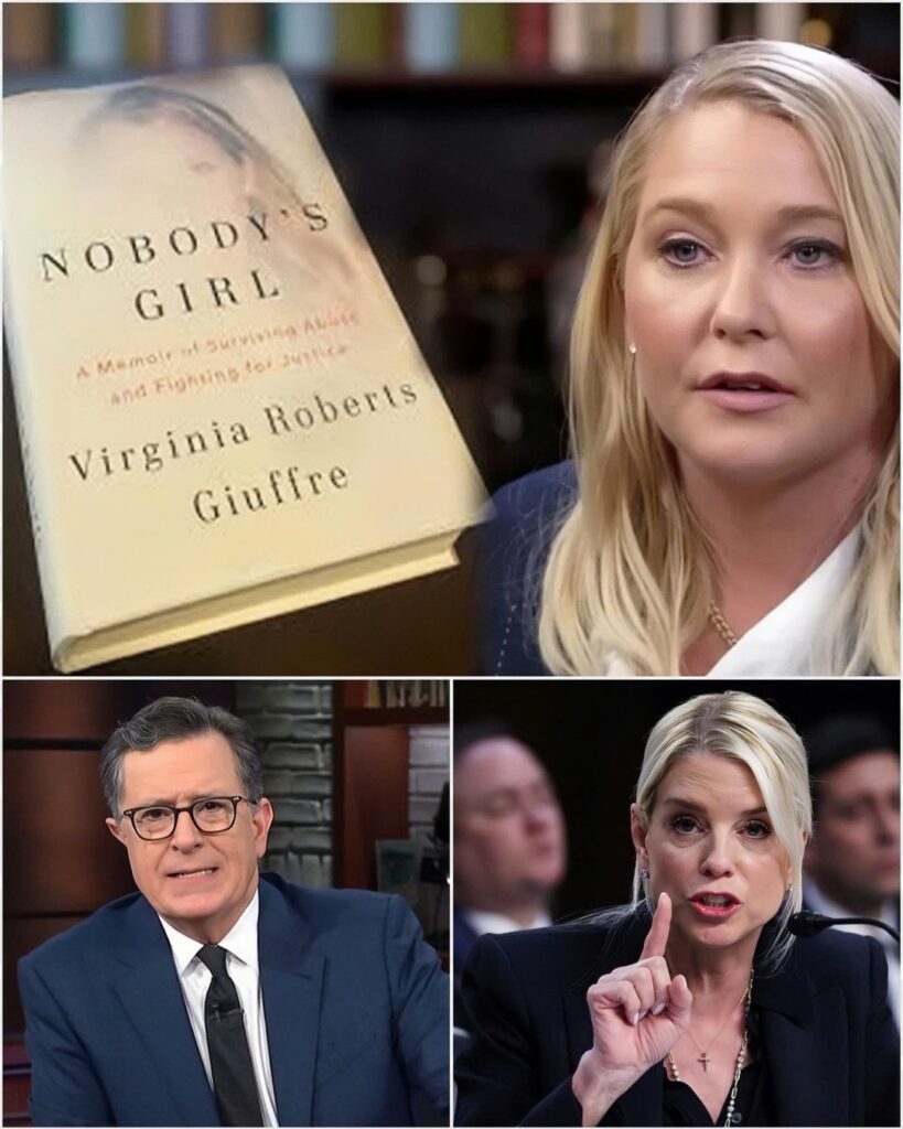According to insiders, the segment wasn’t planned. Producers backstage exchanged frantic glances as Colbert pushed aside his cue cards and reached beneath his desk. When he lifted Virginia Giuffre’s memoir into the frame, the audience fell silent instantly. It wasn’t a prop. It wasn’t a setup for humor.