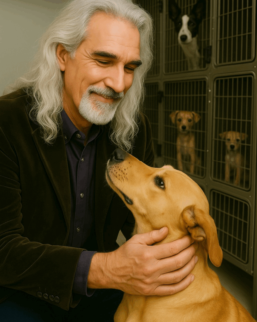 He walked through the narrow aisles, pausing at each cage. One by one, noses pressed to the bars, tails wagged weakly. Guy knelt down, speaking softly to each dog as if greeting an old friend. His voice, the same voice that had filled concert halls, now filled a small room heavy with sadness — but it sounded like hope.