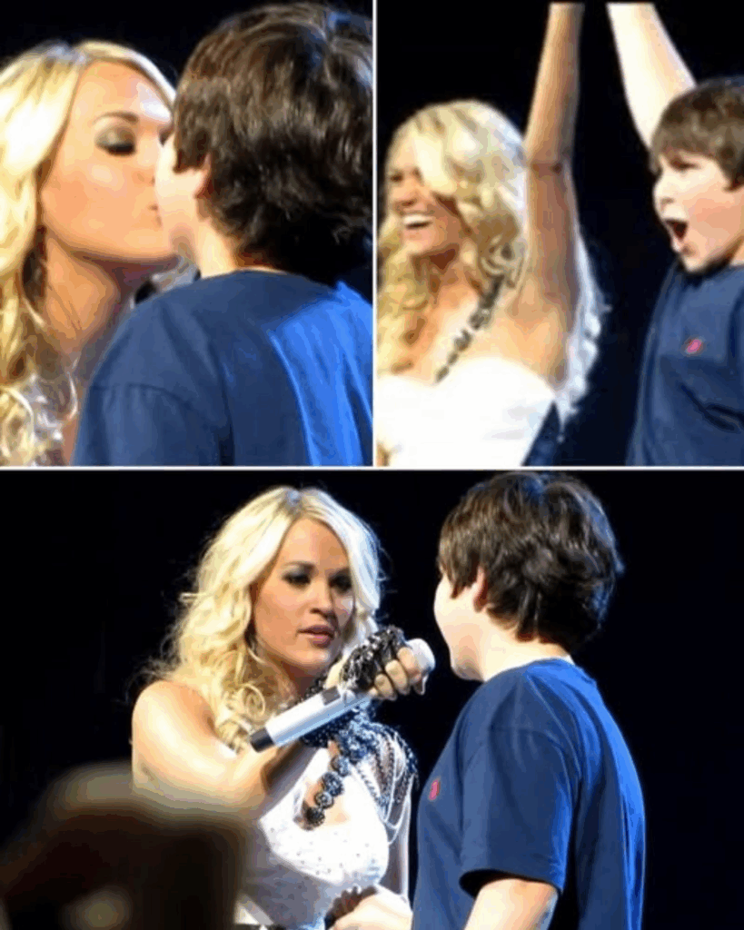 The arena absolutely erupted. Carrie herself let out a theatrical gasp before breaking into genuine laughter, charmed by his honesty. Playing along beautifully, she first leaned in and planted a sweet, tender kiss on his cheek. But the crowd wasn’t satisfied. Fueled by their deafening cheers, she leaned down one more time and gave the boy a quick, gentle peck on the lips. The thousands in attendance rose to their feet in a thunderous standing ovation.