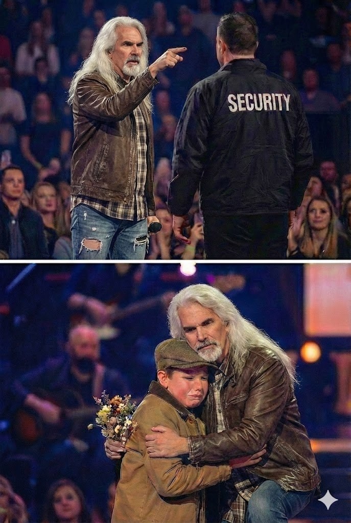 Near the front barricade, security guards were restraining a small, scruffy boy who clearly did not belong to the usual profile of concertgoers filling the room. He was thin, visibly nervous, and clutched in his hands a crumpled bundle of wilted wildflowers. He had no ticket. And by standard protocol, that should have been the end of the story.