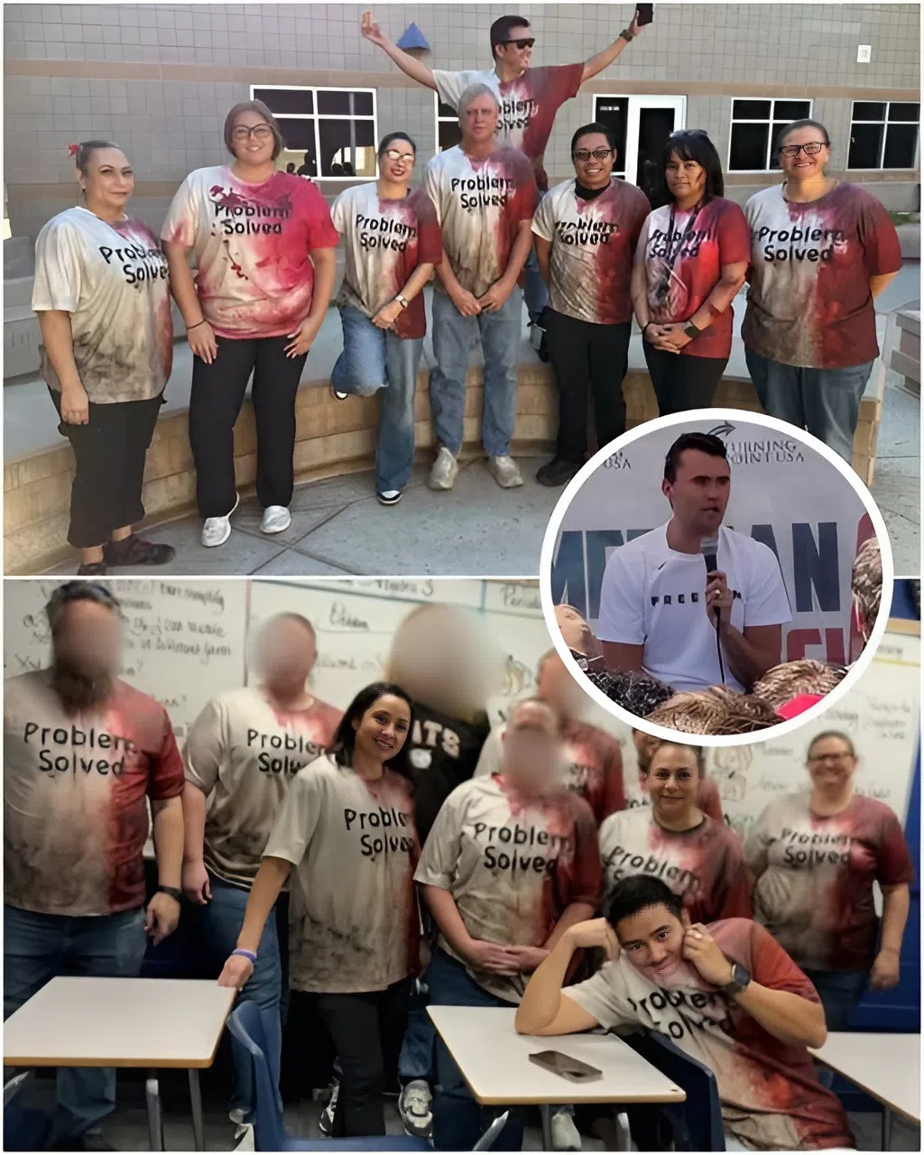Concerned parents just sent us this image of what’s believed to be teachers in @vailschools in Tuscon, Arizona mocking Charlie’s murder with costumes that read “Problem Solved” and blood down the left side of their shirts.