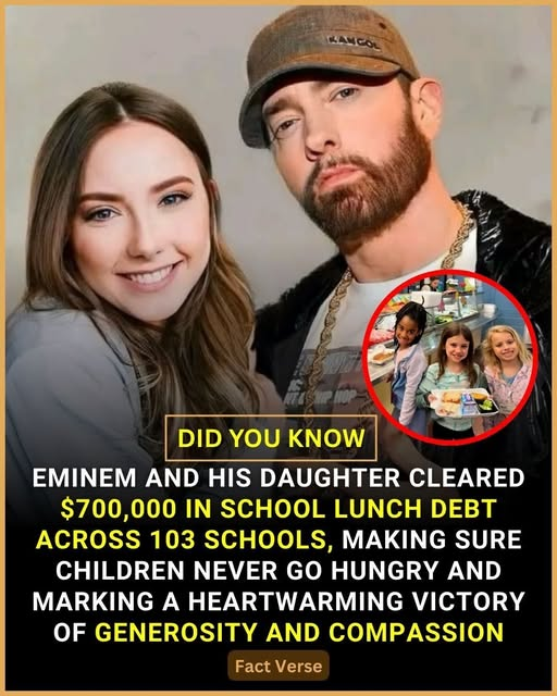 It wasn’t a concert stage. There were no flashing cameras, no roaring crowds, no platinum plaque mounted on the wall. Instead, a single leaked photo — Eminem seated at a plain wooden table, silently signing a massive check — sent the internet spiraling into meltdown. At his side stood his daughter, Hailie, in tears, holding a clipboard listing hundreds of schools drowning in unpaid lunch debt. And for once, this wasn’t about music, awards, or industry dominance. It was about kids — thousands of them — who show up to school hungry, embarrassed, or afraid because they owe money for a meal. By the time the check was signed, over $700,000 in school lunch debt across 103 schools had quietly vanished.