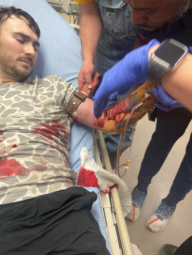 Hunter instinctively grabbed his arm, but blood poured through his fingers and onto the ground. Within moments, his skin turned pale and his breathing grew shallow. Someone called 911 while another friend applied pressure using a clean shirt. Realizing the bleeding wouldn’t slow, they improvised a tourniquet using a belt — tightening it above the injury in a desperate attempt to stop the flow.