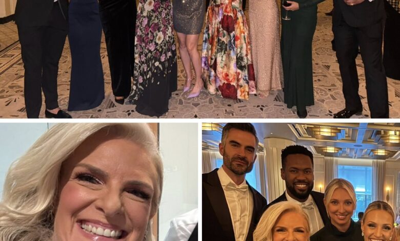 In the image, the cast stands arranged in immaculate evening wear, each figure holding a pose meant for glossy magazine spreads. Emily Compagno commands the center with effortless charisma, her expression sharp and mischievous, as though she already knew she had a story to drop that would set the internet ablaze. To her side, Ainsley Earhardt beams with polished warmth. Carley Shimkus leans in with an unmistakable sparkle in her eyes. Kennedy’s stance adds edge. Brian Kilmeade appears caught mid-laugh. And Janice Dean — radiant and strong — glows with the kind of presence that makes the room look brighter.