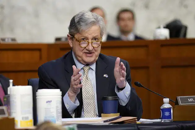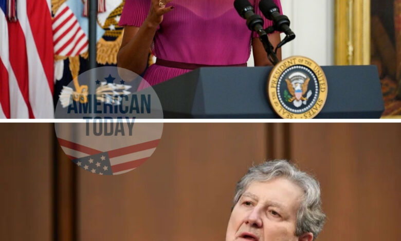 The courtroom was already vibrating with tension before the hearing even began, but the moment Michelle stepped inside, the atmosphere cracked like ice under pressure. In the image, she sits stiffly at the plaintiff’s table, chin lifted high, shoulders locked, eyes sharp with the determination of someone who believes the world owes her victory. Across the room, Senator John Kennedy’s legal team sits like a wall—unbothered, steady, almost bored. It’s the kind of posture that says they came prepared for war… and expected to win.