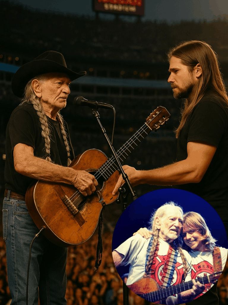 Just moments ago in Nashville, under the shimmering lights of Nissan Stadium, something unforgettable happened. It wasn’t just another concert. It wasn’t just another night in country music history. It was a sacred passing — quiet, raw, and filled with generational love. Willie Nelson, 92, did what no one expected: he took off Trigger, the beat-up Martin N-20 guitar that has walked every road beside him for over five decades, and gently placed it into the hands of his son, Lukas.