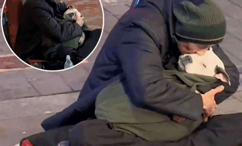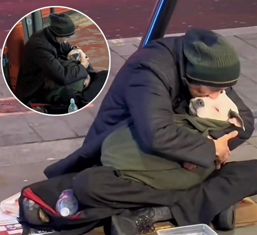 Every night, in a dimly lit corner under an old brick awning, a homeless man sits with a small, brown-and-white dog curled in his lap. His coat is worn, his shoes are torn, and his face carries the quiet tiredness of someone who has gone too long without rest. Yet, in his arms, he rocks his dog gently—slow, rhythmic motions, almost like a lullaby without sound.