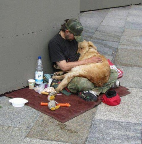 f.A homeless man has captured the attention of thousands, not for begging, but for the way he rocks his dog to sleep every night.f