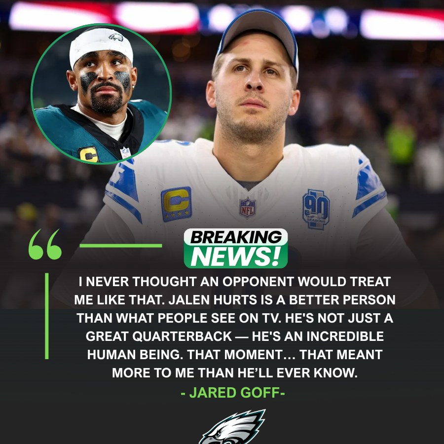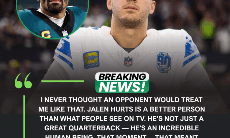 Jalen Hurts — the quarterback who had just secured Philadelphia’s eighth win of the season — suddenly broke away from the team’s postgame huddle. Instead of celebrating with teammates near midfield, Hurts walked directly toward the Lions bench. He stopped quietly behind Goff, placed a steady hand on the veteran’s shoulder, and pulled him into a brief, sincere embrace.