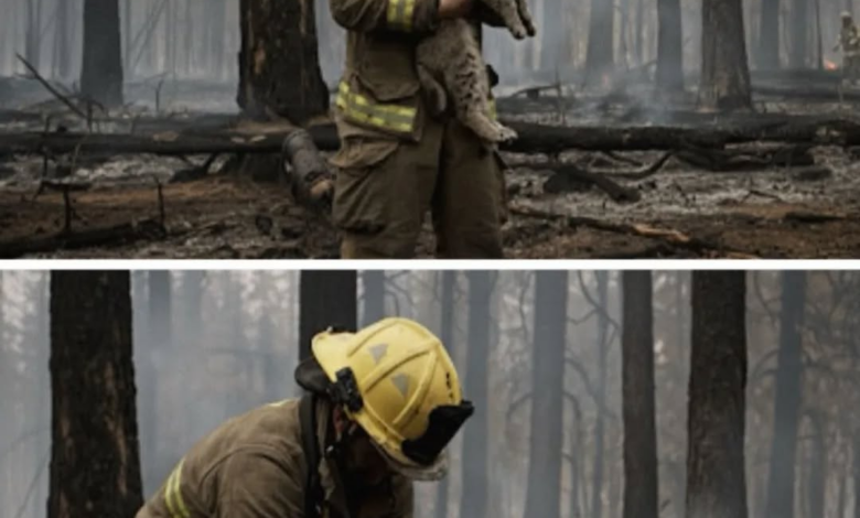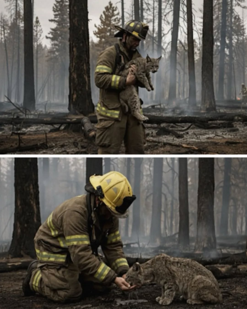 Once clear of the flames, the firefighter knelt in the dirt. He poured water into his hands, cupping it carefully so the bobcat could drink. With each lap of its tongue, the animal’s trembling eased. It was alive. Alive because one man chose to see value where others might have seen only risk.
