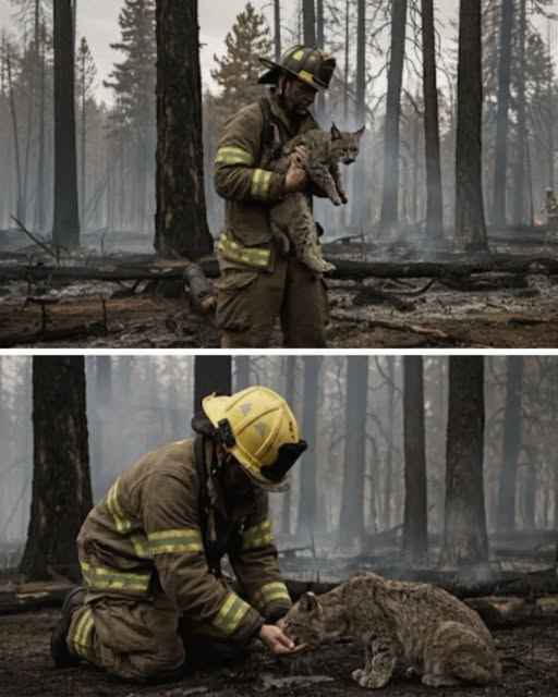 Once clear of the flames, the firefighter knelt in the dirt. He poured water into his hands, cupping it carefully so the bobcat could drink. With each lap of its tongue, the animal’s trembling eased. It was alive. Alive because one man chose to see value where others might have seen only risk.