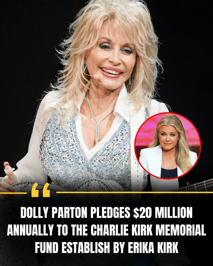 In a stunning announcement that has sent shockwaves across America, country music icon and beloved philanthropist Dolly Parton has pledged an extraordinary $20 million every year to the Charlie Kirk Memorial Fund, a foundation dedicated to advancing education, faith-based youth programs, and community rebuilding projects across the nation.