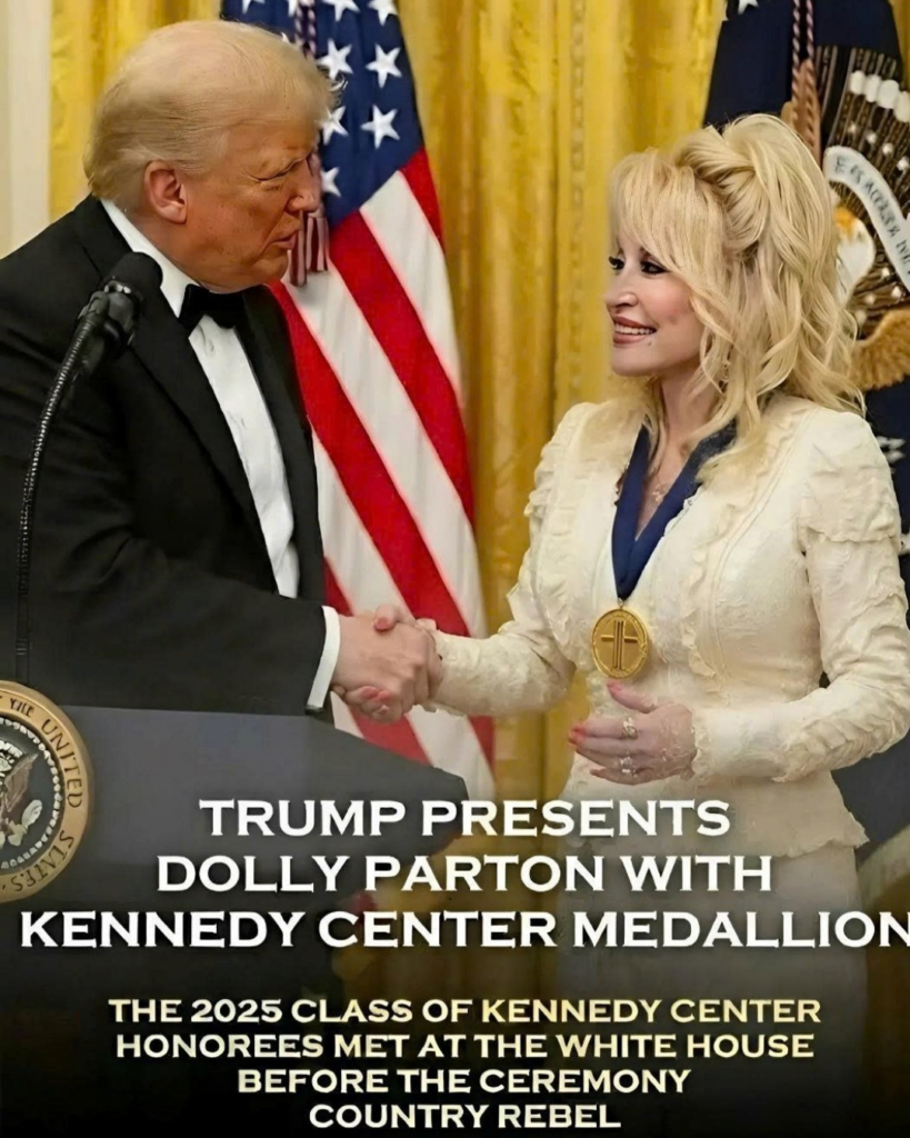 The ceremony at the Kennedy Center took a charming and unexpected turn when Dolly Parton stepped onto the stage glowing with her signature sparkle. As President Donald Trump prepared to present the award, the room fell into a respectful hush — until he paused, glanced at Dolly’s unmistakable blonde hair, and joked, “I think the spotlight might be jealous of your shine tonight.” The audience burst into laughter, and Dolly threw her head back with that unforgettable Tennessee giggle.