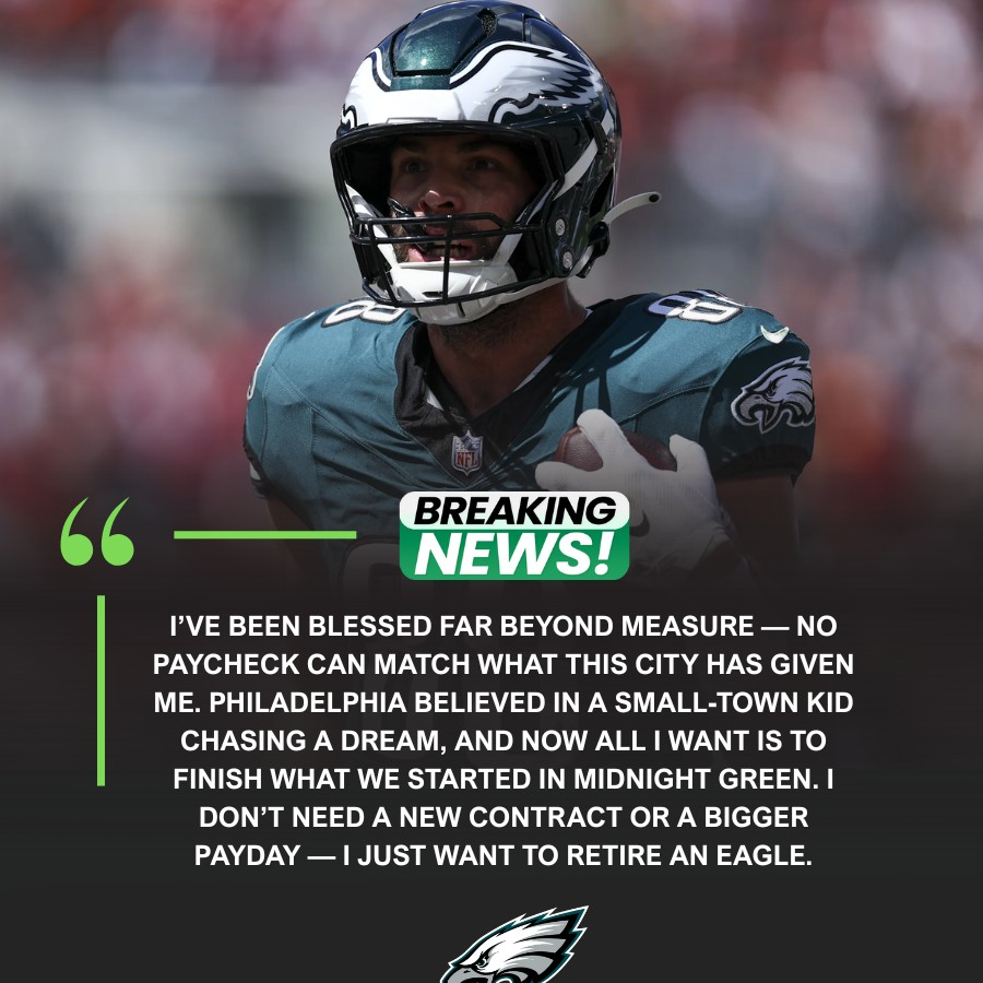 That’s when Dallas Goedert stepped in and changed everything. Instead of waiting for negotiations or demanding reassurances, the veteran tight end walked into the front office and stunned everyone — he offered to take a pay cut to help the team manage its cap space. It wasn’t a stunt or a headline grab. It was a genuine gesture from a man who sees Philadelphia not as an employer, but as home.