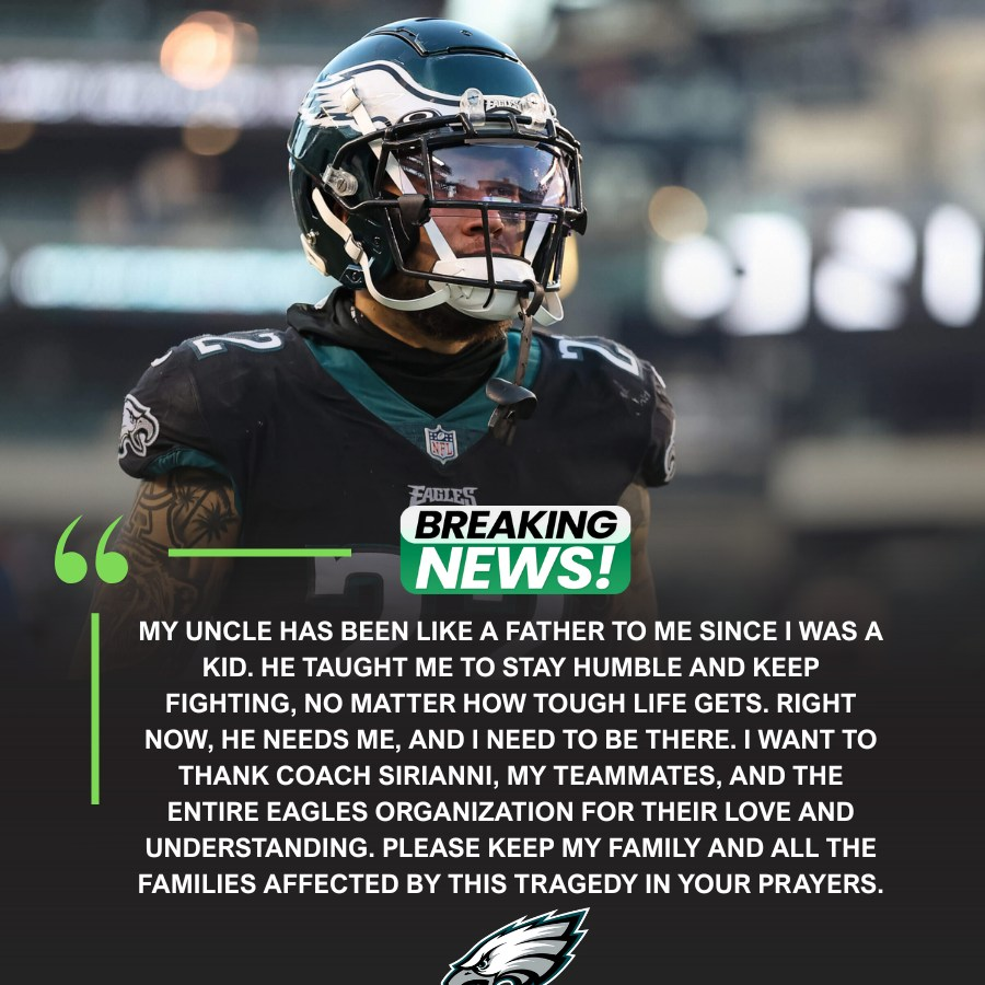 “My uncle has been like a father to me since I was a kid. He taught me to stay humble, to stay grounded, and to keep fighting when life gets tough. Right now, he needs me — and I need to be there. I want to thank Coach Sirianni, my teammates, and the Eagles organization for their love and understanding. Please keep my family and all the families affected in your prayers.”