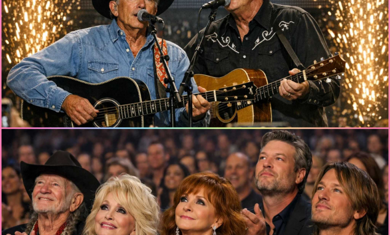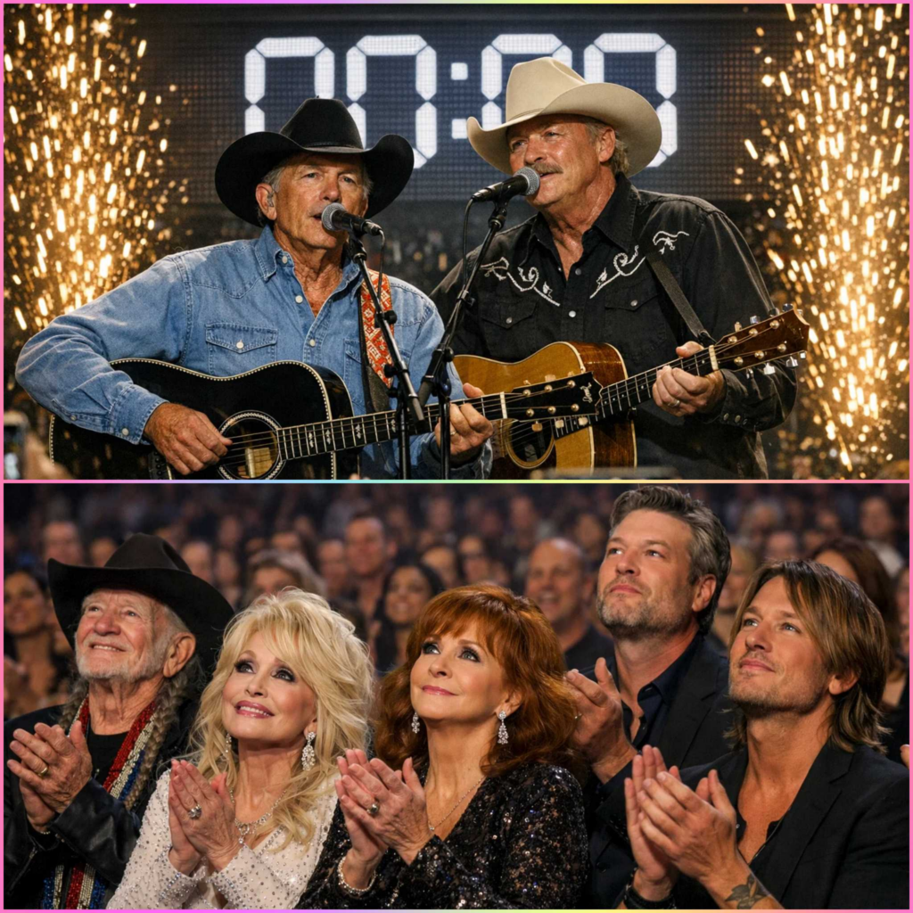 On a night designed for noise—confetti, countdown clocks, flashing lights, and performances built to keep the world awake—there was a moment that did the opposite. It made the arena go quiet. It made people forget the cameras. It made time slow down like a prayer. As New Year’s Eve edged toward midnight, George Strait reached out and took Alan Jackson’s hand, and the room felt something shift. Not surprise. Recognition. The kind that arrives when two voices that helped shape an entire genre stand together again and let the music speak for itself.