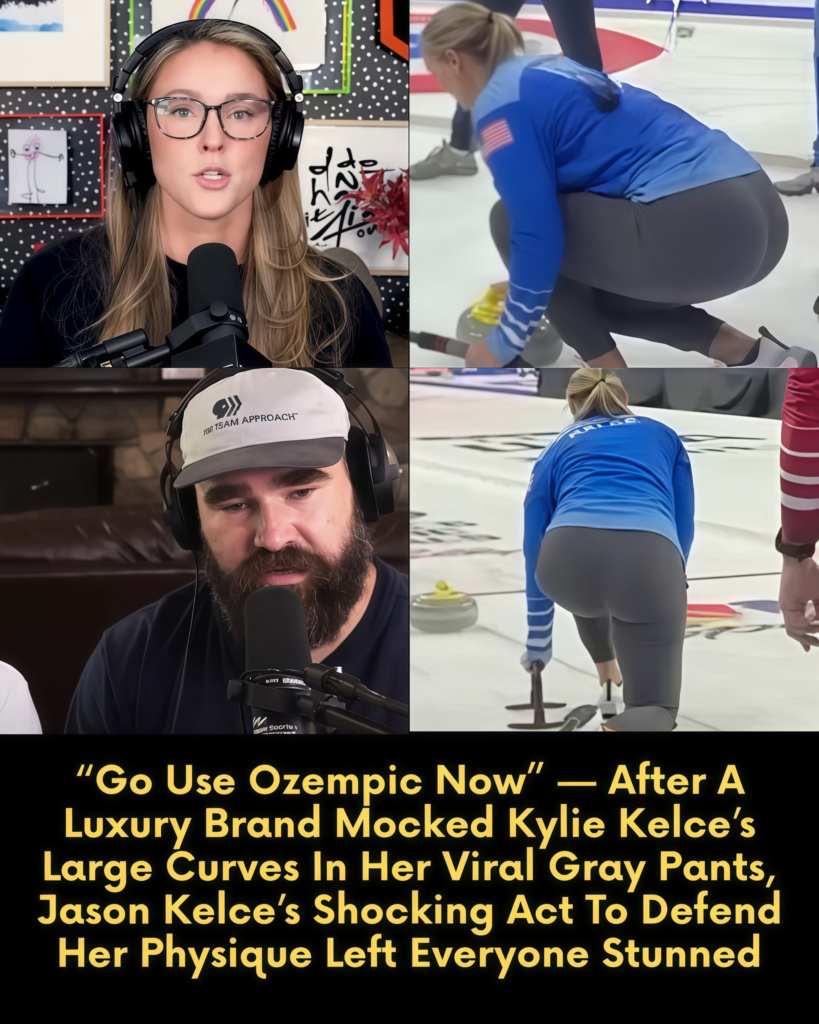 In the world of the NFL, the Kelce family has always stood for grit, humor, and unfiltered authenticity. But in January 2026, the spotlight shifted from the football field to a viral video that sparked a firestorm of controversy. When Kylie Kelce appeared on the “New Heights” podcast in a pair of skin-tight gray sweatpants while learning to curl, the internet didn’t focus on her athletic skills. Instead, they focused on her “large” postpartum curves. While Kylie handled the comments with her signature wit, a luxury brand took the insults to a dangerous level, leading to a confrontation that has left fans everywhere stunned.