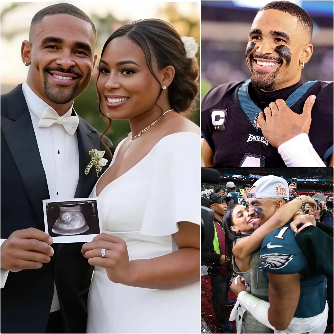 The baby reveal was pure magic, unfolding like a highlight reel of love. In the 2-minute clip—shot in their cozy Philly home with Eagles memorabilia as the backdrop—Jalen and Bry sat cross-legged on a plush green rug, a gender reveal cake between them. “Y’all know we’ve been on a roll—Super Bowl, wedding bells, and now… family goals,” Jalen grinned, his signature dimples flashing. Bry, glowing in a flowy Eagles jersey (custom “Mom of MVP”), added, “This little one’s got Jalen’s grit and my heart. We’re naming him Eagle Jett Hurts—Eagle for the nest we’re building here in Philly, Jett for the speed that’ll make him a future star.” A confetti popper exploded in midnight green and white, confirming the boy bombshell, followed by ultrasound pics and a nursery mood board featuring tiny cleats and a mini Lombardi Trophy. The video ended with Jalen tearing up: “God’s timing is perfect. To our Philly family and beyond—thank you for the love. We’re ready to pass the torch.”