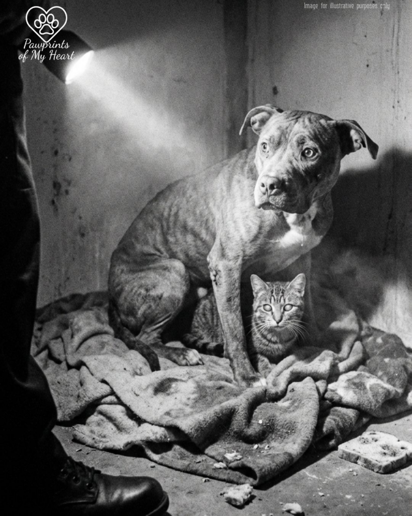 Scattered around them were crusts of moldy bread. The Pitbull’s ribs jutted sharply through his skin. He was skeletal, clearly starving. And yet the crumbs had been nudged toward the cat’s mouth, not his own.