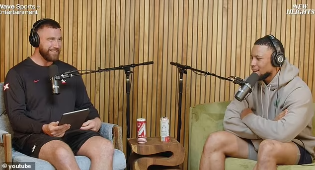 Kelce joked on New Heights, which featured a special guest in Saquon Barkley (right), that he has piled on the pounds in the offseason