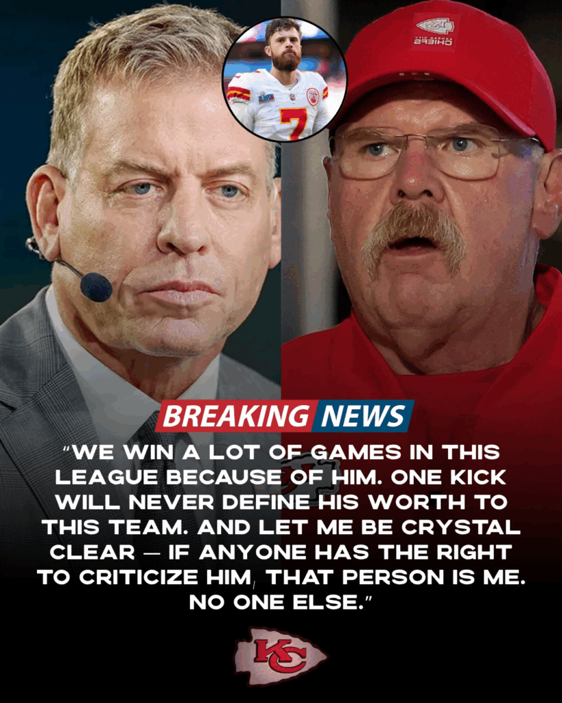f.Troy Aikman Publicly Blasts Harrison Butker After Chiefs’ Loss to Broncos — Andy Reid Immediately Defends His Kicker in Fiery Postgame Statement.f