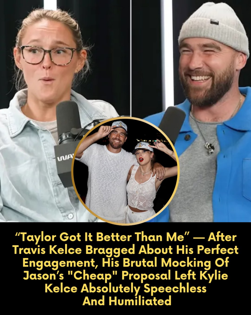 The Kelce brothers have always been known for their unfiltered honesty and brotherly jabs, but the latest episode of the Not Gonna Lie podcast has sent the internet into a total tailspin. While Travis Kelce is currently riding the high of his August 2025 engagement to global icon Taylor Swift, he decided to take a trip down memory lane—at his brother Jason’s expense. What started as a lighthearted guest appearance quickly turned into a brutal comparison that left Kylie Kelce, the beloved matriarch of the family, questioning everything she thought she knew about her own engagement.