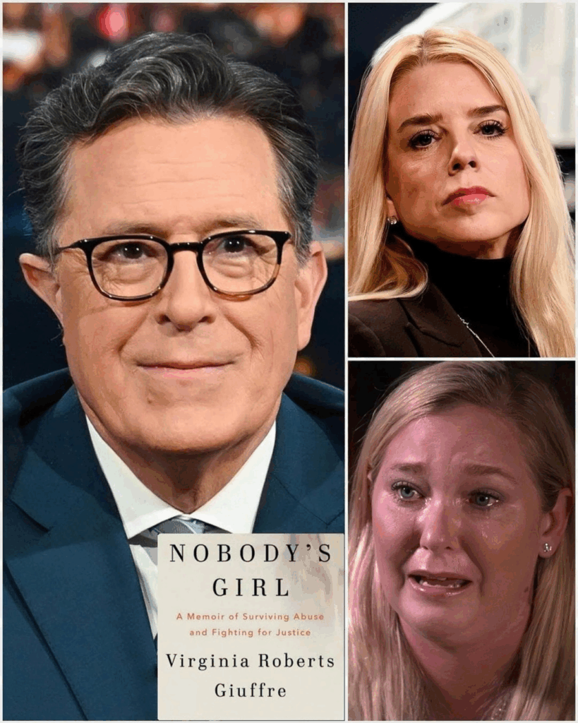 In a moment unlike anything ever witnessed on The Late Show, Stephen Colbert left his audience — and the country — in stunned silence during a segment intended to honor Virginia Giuffre. What began as a thoughtful tribute suddenly turned into one of the most emotionally charged minutes in modern television, as Colbert visibly trembled while delivering an unscripted monologue that instantly set social media ablaze.