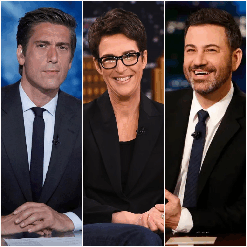 But last night, in a dramatized behind-the-scenes television scenario that has since gone viral, three of America’s most recognizable media personalities — David Muir, Rachel Maddow, and Jimmy Kimmel — staged a coordinated on-screen walkout that viewers are calling “the most shocking fictional media revolt ever filmed.”