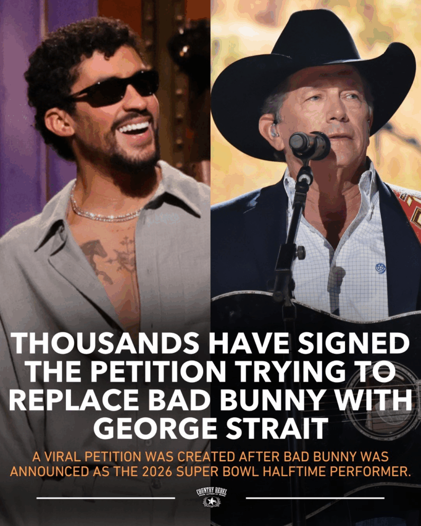 A wave of country pride is sweeping across the nation as thousands of fans unite behind a viral petition demanding George Strait — the King of Country — take the stage at the next Super Bowl Halftime Show, replacing global pop star Bad Bunny.