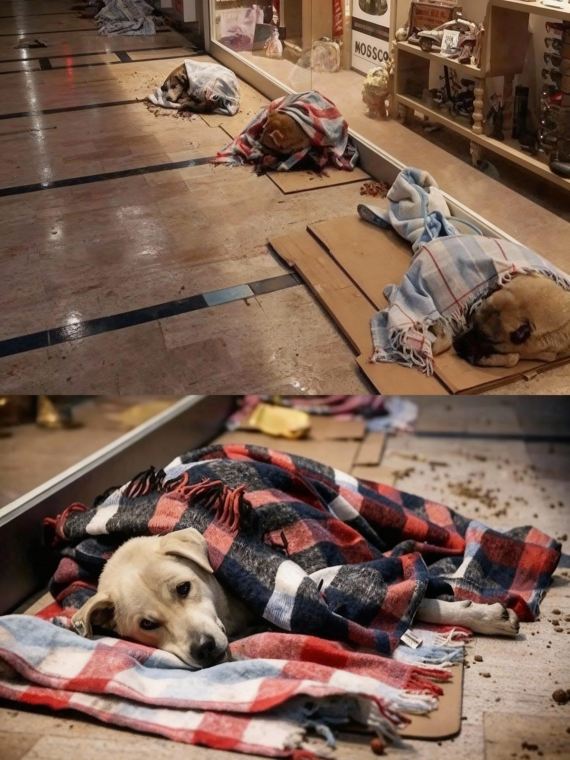 The quiet hush of a closed mall after hours often conjures images of deserted corridors and silent storefronts. Yet, in some corners of the world, these spaces take on a profoundly different meaning, becoming an unlikely refuge for the most vulnerable among us: stray animals. The striking image before us, depicting several dogs nestled under blankets on cardboard, their weary bodies finding solace on cold tile floors, is more than just a snapshot; it’s a poignant testament to both the harsh realities faced by homeless creatures and the unexpected wellsprings of human kindness. These aren’t animals in a shelter, nor are they simply wandering the streets. They are deliberately cared for, their comfort clearly a priority for someone. This scene invites us to look beyond the immediate visual and ponder the stories behind these silent sleepers, the hands that offered them warmth, and the broader societal implications of such an act of compassion. It challenges us to reconsider our perceptions of public spaces, the plight of strays, and the quiet heroes who step up when no one else is watching. The details – the patterned blankets, the scattered debris suggesting a shared meal, the peaceful slumber of animals usually on high alert – all paint a picture of deliberate care, a makeshift sanctuary forged from empathy in an otherwise impersonal environment.