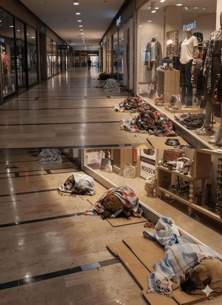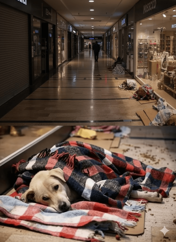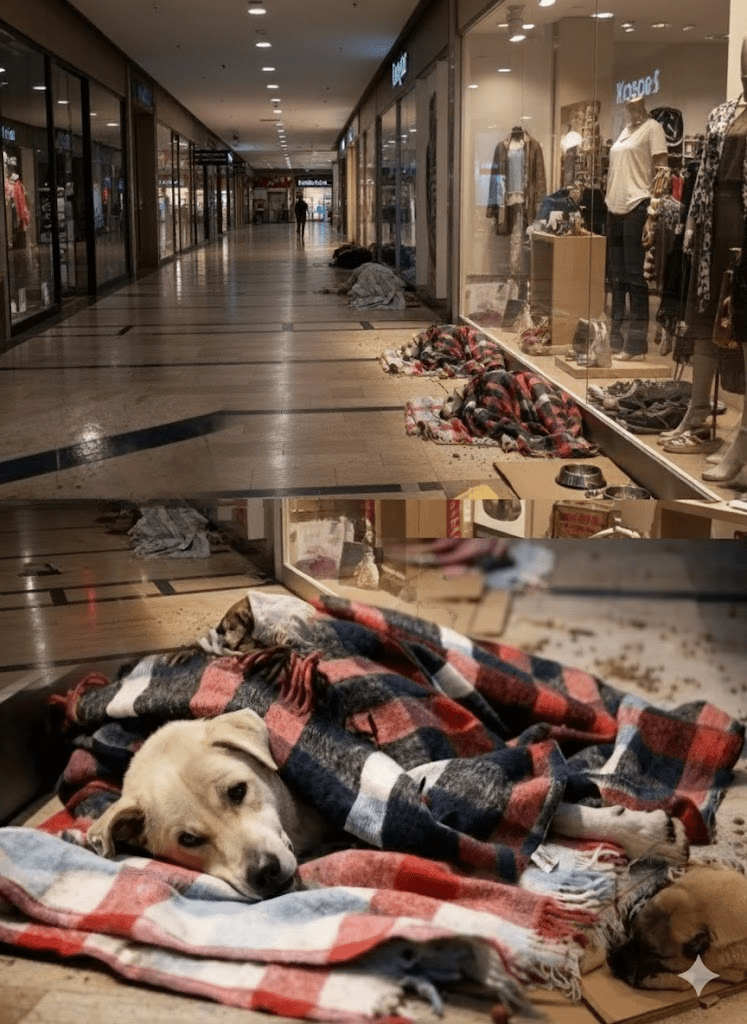The sight of these dogs, seemingly at peace in such an unconventional setting, raises immediate questions about the circumstances that led them here. For countless stray animals worldwide, life is a daily struggle for survival, marked by hunger, exposure, and constant danger. Abandonment, overpopulation, and a lack of proper animal welfare infrastructure contribute to this global crisis. Malls, with their climate control and relative security compared to the open streets, might offer a temporary respite, especially during harsh weather. The fact that they are covered with blankets and have what appears to be scattered food nearby suggests not just opportunistic shelter-seeking, but rather a concerted effort by someone to provide for their basic needs. This transformative act highlights how individual compassion can create pockets of safety even within the most unlikely of urban landscapes, offering a stark contrast to the often indifferent world outside.