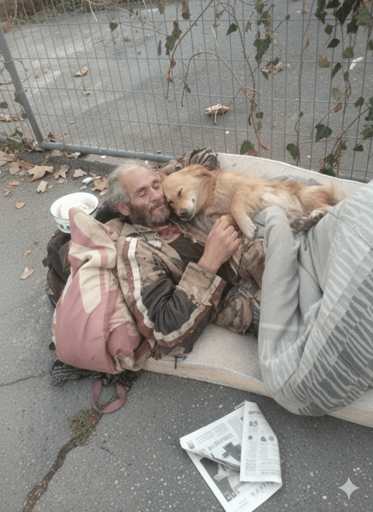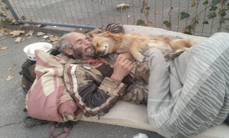 The image before us tells a poignant story, a silent narrative whispered on a cold, hard street. It depicts a man, weathered by life’s harsh realities, finding solace and warmth in the embrace of his loyal canine companion. This isn’t just a picture; it’s a window into the unseen world of homelessness, a world often overlooked, misunderstood, and unfairly judged. It challenges our preconceived notions and forces us to confront the raw, unfiltered truth of human existence at its most vulnerable. The man’s tattered clothes and makeshift bed speak volumes of his struggle, yet the peaceful slumber of the dog nestled against him speaks even louder of an unbreakable bond, a beacon of hope in a desolate landscape. This image compels us to look beyond the surface, to see the individual, the story, and the profound connection that transcends all societal barriers. It’s a testament to the enduring power of companionship, a stark reminder that even in the darkest of times, love and loyalty can provide a sanctuary. It is a call to action, an unspoken plea to acknowledge the humanity in every individual, regardless of their circumstances, and to recognize the silent suffering that often goes unnoticed in the shadows of our bustling cities.