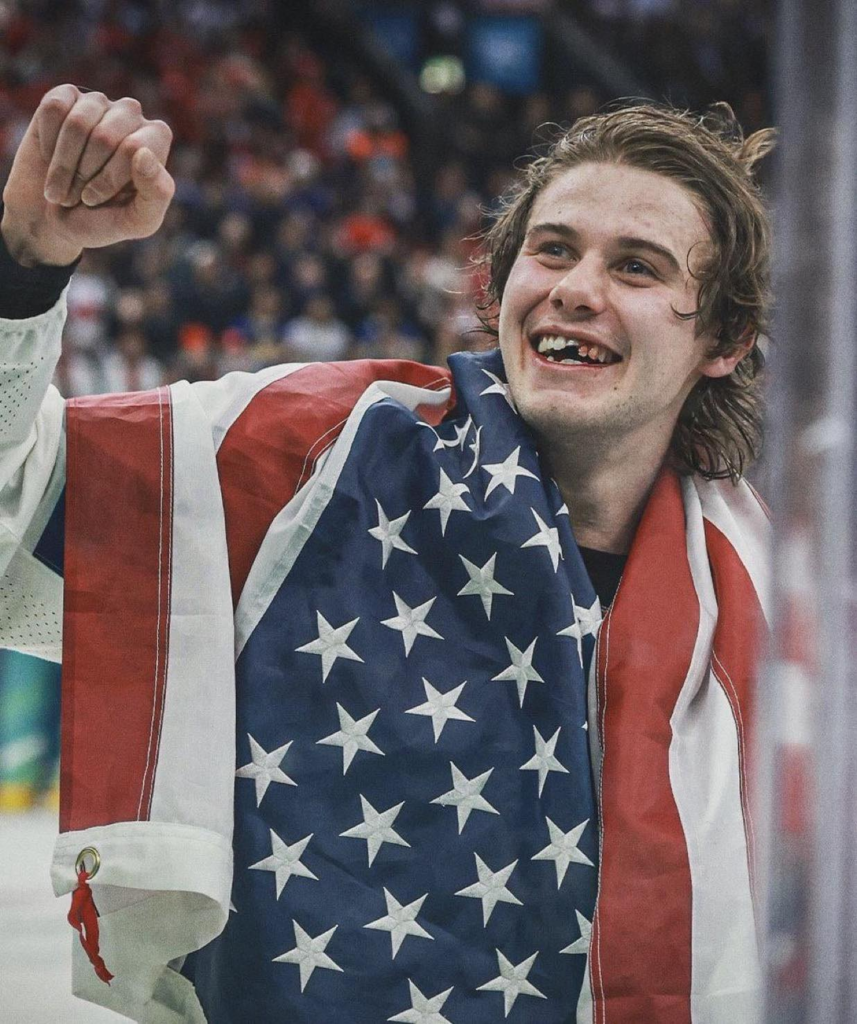 And standing at the center of it all was Jack Hughes, draped in red, white, and blue, the weight of an Olympic gold medal resting against his chest.