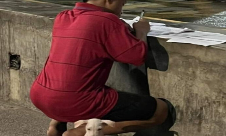 Every night, as darkness falls over his modest home with no electricity, this young boy gathers his books and heads to the nearest patch of light — sometimes under a streetlamp, sometimes outside a shop — determined to keep learning. And there, beside him, always sits his loyal companion, a stray dog who has become his guardian, his warmth, and his strength.