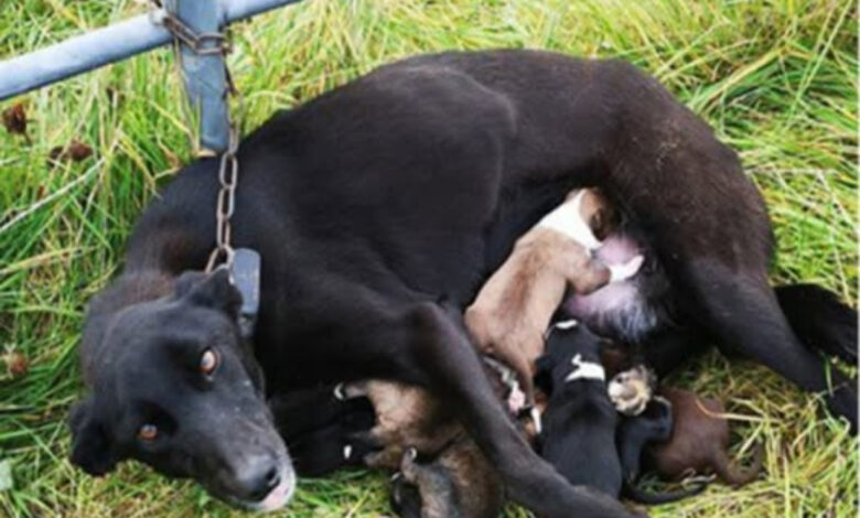 In the quiet stretch of a remote field, rescuers stumbled upon a scene that stopped them in their tracks—a young two-year-old lurcher, her body frail yet determined, [ch.ain.ed] tightly to a metal fence post. Curled at her feet were her six newborn puppies, still blind to the world and far too young to fend for themselves. They had no food, no water, and no protection beyond the courage of their mother.