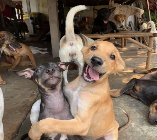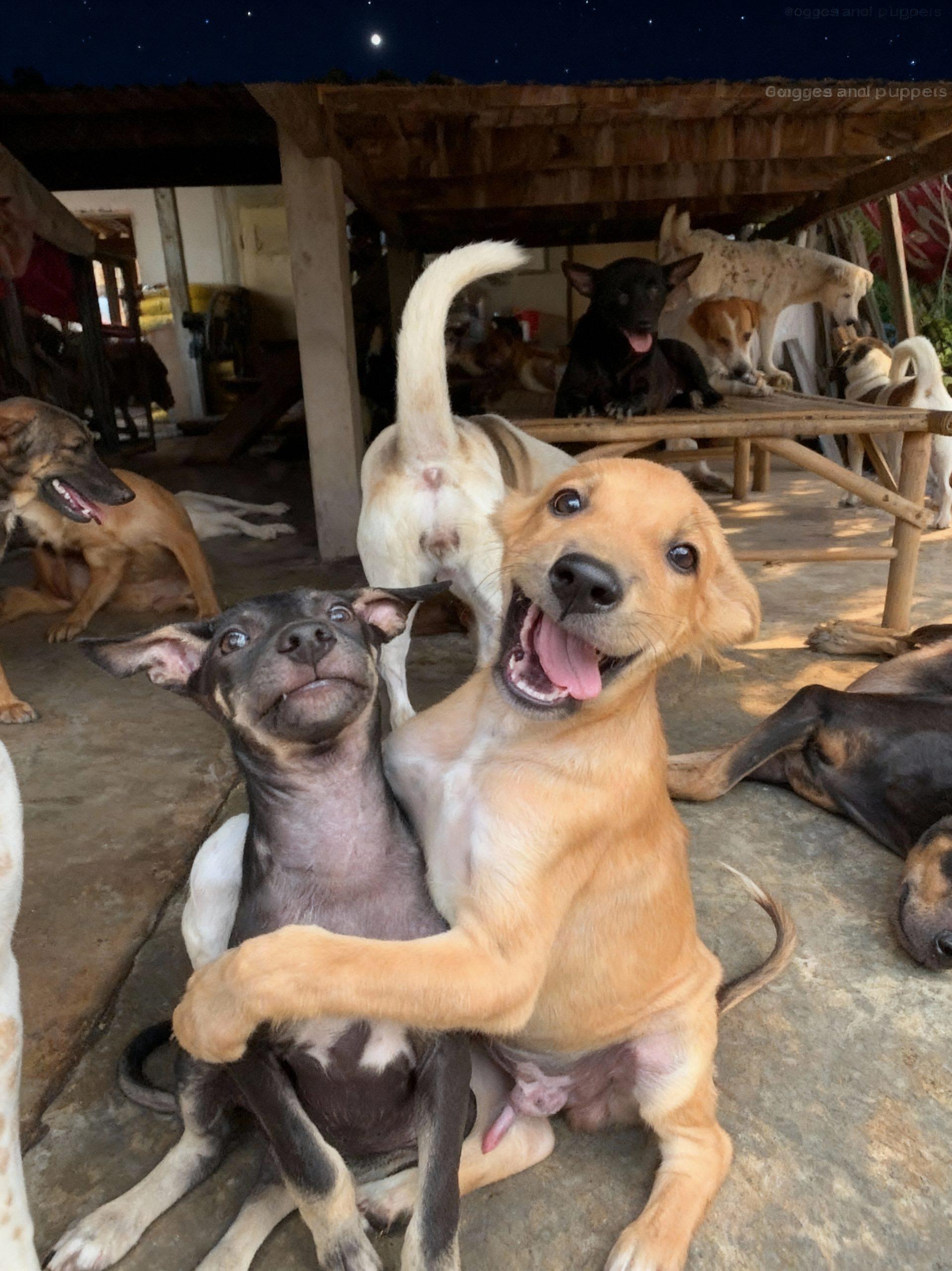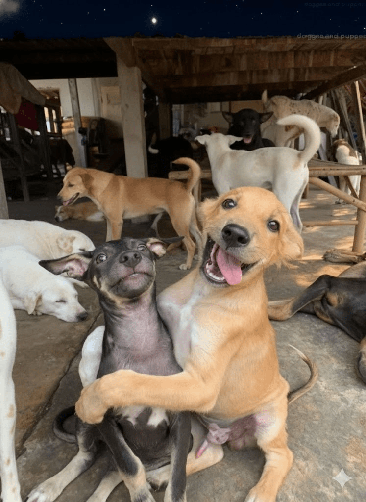 Two delightful dogs are captured in a heartwarming embrace, their joyful expressions a testament to the simple pleasures of companionship. The dog on the right, a radiant golden retriever mix, grins widely at the camera, its eyes sparkling with mirth and its tongue playfully lolling out. Its front paws are gently wrapped around its companion, a sleek black and tan pup with an equally endearing, slightly mischievous grin. This smaller dog leans into the embrace, its ears perked and its gaze directed upwards, as if sharing a secret joke with its friend. Their postures convey a genuine sense of affection and contentment, creating an instantly captivating scene. In the background, a rustic outdoor setting unfolds, hinting at a lively and communal environment. Other dogs can be seen lounging and interacting, suggesting a bustling animal sanctuary or a well-loved home with many canine residents. The overall impression is one of warmth, happiness, and the undeniable bond between animals.