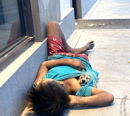 In the quiet corners of our bustling cities, where the rhythm of daily life often drowns out individual stories, there exists a profound narrative of resilience, companionship, and the unspoken bonds that sustain us. The image before us, a poignant snapshot of a person finding solace and warmth with a small dog nestled against their chest, offers a window into this often-overlooked reality. It’s a powerful visual testament to the deep-seated human and animal need for connection, a need that intensifies when faced with adversity. This isn’t just a picture of someone resting on a sidewalk; it’s an emblem of survival, an illustration of how, even in the most challenging circumstances, the presence of another living being can provide comfort, security, and a vital sense of belonging. The dog, tucked safely, seems to mirror the trust and vulnerability of its human companion, creating a shared space of refuge against the harshness of the outside world. This image compels us to look beyond the immediate scene and consider the broader implications of homelessness, the silent struggles faced by countless individuals, and the extraordinary ways in which companionship, particularly with animals, can offer a beacon of hope and a source of unwavering support. It challenges us to reflect on our own perceptions of value, connection, and what truly constitutes a home.