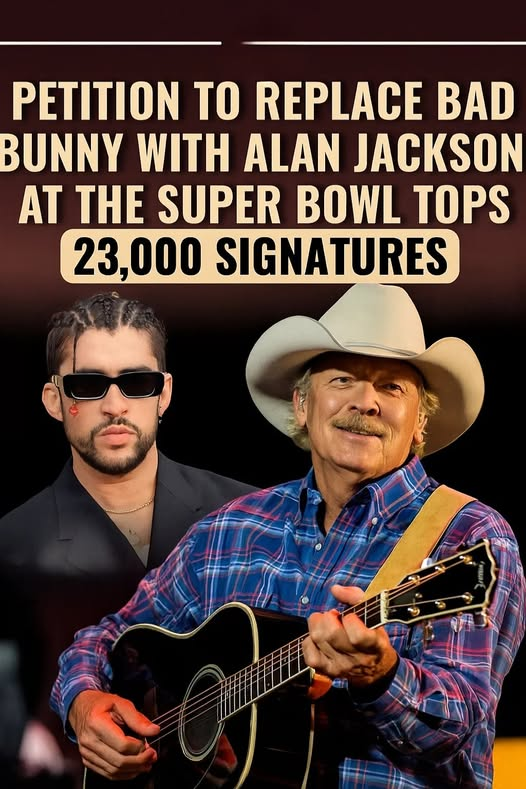 More than 23,000 fans have already signed a petition demanding that Alan Jackson, one of country music’s most revered legends, take the stage in place of reggaeton superstar Bad Bunny. What started as a few posts on fan forums has exploded into a viral movement across social media platforms — uniting country fans from Nashville to Nebraska under one rallying cry: “Give us real country on the biggest stage.”