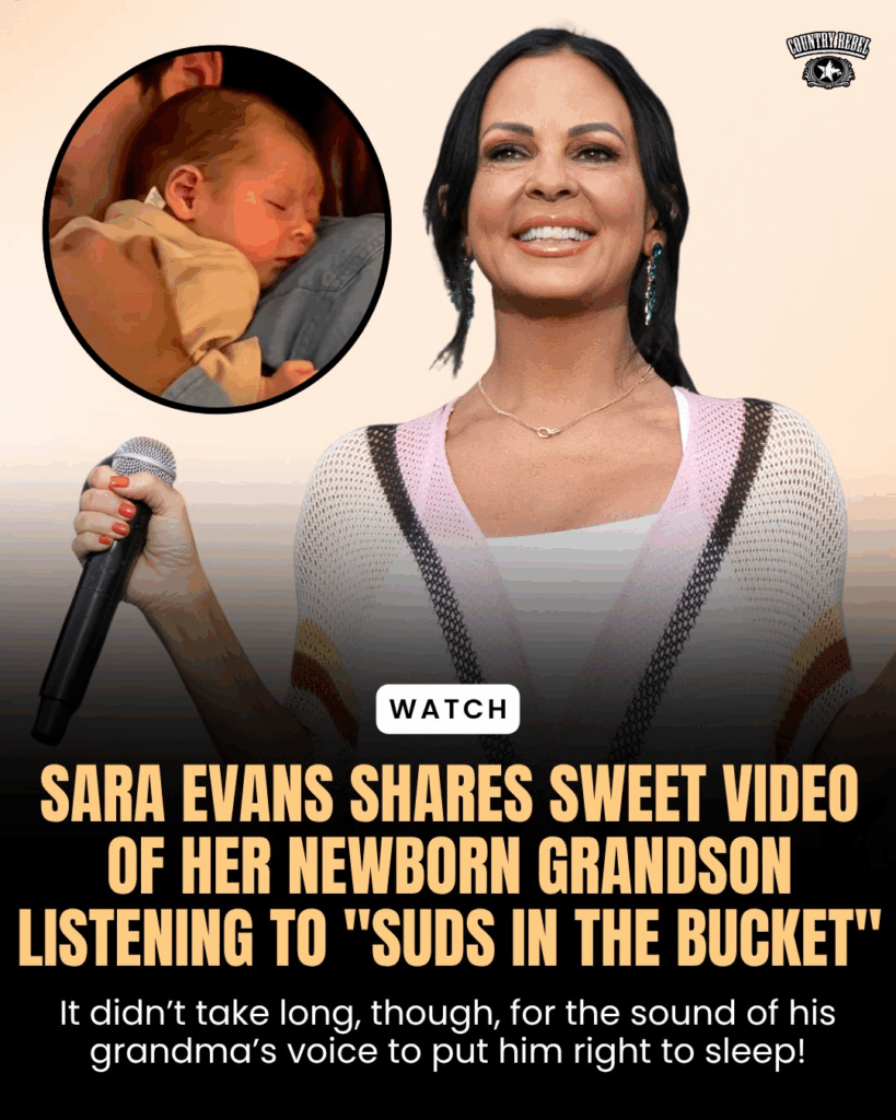 Watch Sara Evans’ newborn grandson fall asleep while listening to her song “Suds in the Bucket” in the video below.