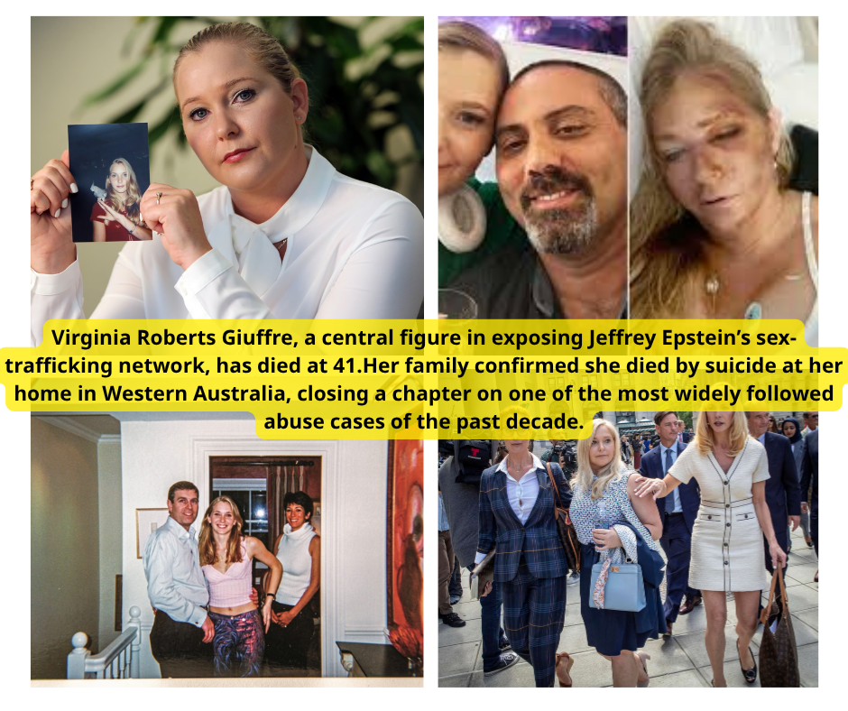 LDT. Virginia Roberts Giuffre, a central figure in exposing Jeffrey Epstein’s sex-trafficking network, has died at 41.Her family confirmed she died by suicide at her home in Western Australia, closing a chapter on one of the most widely followed abuse cases of the past decade.