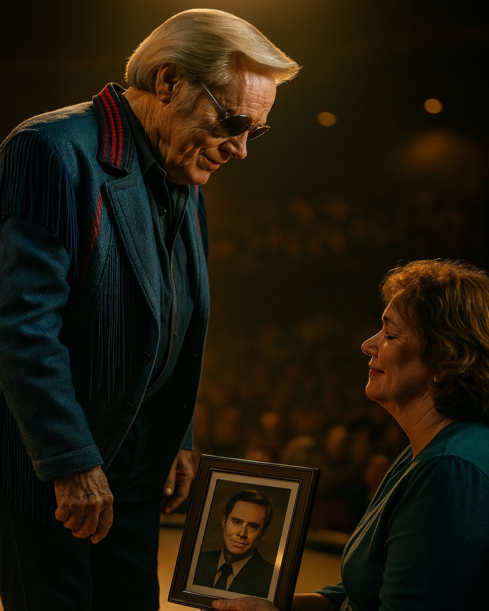 In the front row sat a woman clutching a framed picture. Not a phone, not a record — but a photograph of her late husband. George noticed it right away. Between verses, his eyes found hers. There was something sacred in that silent exchange — a kind of understanding that only two people who’ve loved and lost could share.
